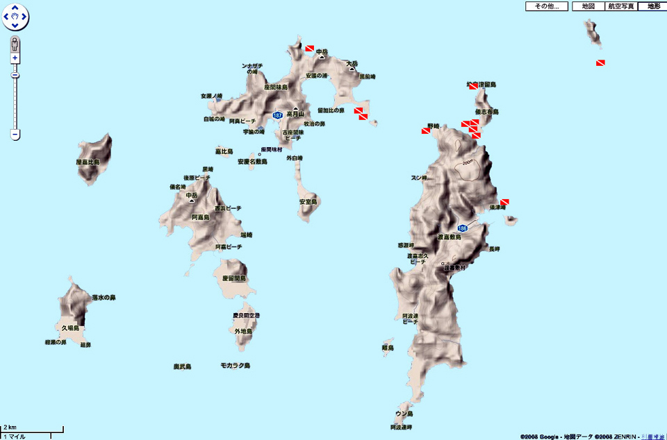 Diving-徒然 今年潜ったところ 2008年12月16日 今年も残すところわずかとなりました。9月下旬にCカードを取得し、ビーチ2本、ボート12本に挑戦しました。ボートは全て慶良間です。慶良間で潜ったポイントを地図にまとめてみました。残念ながら名前を入れていません。将来に書けなくなる恐れがあるので、はじめから省いたのです。ポイントの詳細はログを参照してください。